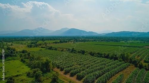 © Rapit, Naklejka premium Aerial view of sugarcane plantation in valley, mountains background.