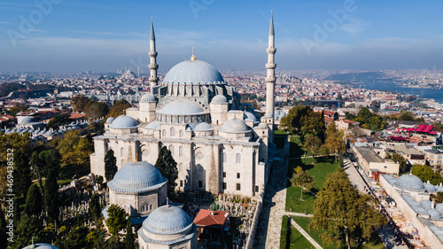 Naklejka premium Aerial view of Suleymaniye Mosque with four minaret in Istanbul,Turkey