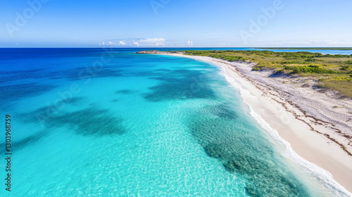Fototapeta premium Aerial view of summer beach and blue ocean under clear sky