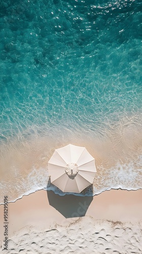 Naklejka premium Aerial View of Sun Umbrella on a Stunning Summer Beach with Large Blank Space for Text