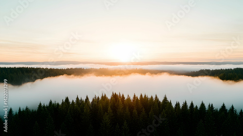 © Zatra, Fototapeta premium Aerial View of Sunrise Over Foggy Forest