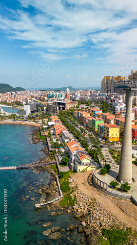 © JKVisuals, Fototapeta premium Aerial view of Sunset Town in Phu Quoc with colorful buildings, the coastal cable car, and the Kiss Bridge. Scenic tropical waterfront and vibrant seaside architecture in Vietnam.