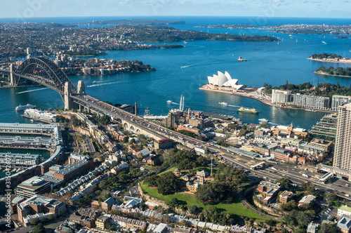 Fototapeta premium Aerial view of Sydney cityscape with Sydney Harbour and landmarks