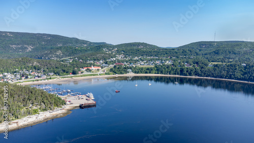 © Michel Guenette, Naklejka premium Aerial view of Tadoussac bay and marina, taken by drone.