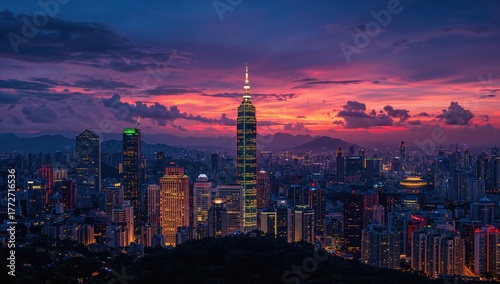 © Cyber Shutter, Fototapeta premium Aerial view of Taipei skyline during sunset, showcasing 101 Tower among contemporary skyscrapers, urban density