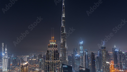 © HyperlapsePro, Fototapeta premium Aerial view of tallest towers in Dubai Downtown skyline and highway night timelapse.