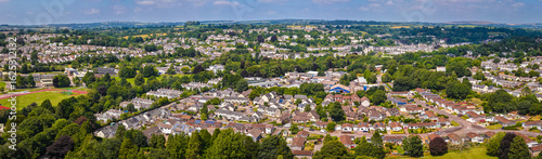 © alexey_fedoren, Fototapeta premium Aerial view of Tavistock, Cornwall, on a sunny day showing town layout, rooftops, and surrounding green countryside