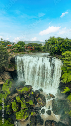 © CravenA, Fototapeta premium Aerial view of Thac Voi - Elephant waterfall, forest and city scene near Dalat city and Linh An pagoda in Vietnam