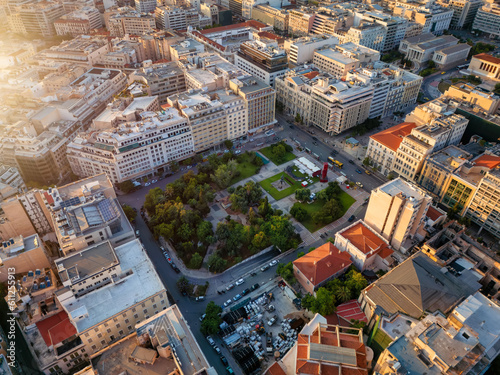 © moofushi, Fototapeta premium Aerial view of the Athens, Greece, skyline with the popular Klafthmonos Square in soft summer sunset light