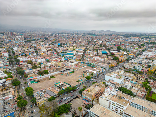 © Paulo, Fototapeta premium Aerial view of the Barranco neighborhood in Lima, Peru in 2023. Spanish colonial style historic buildings. Neighborhood with new houses and also many houses degraded by time. Gastronomic region