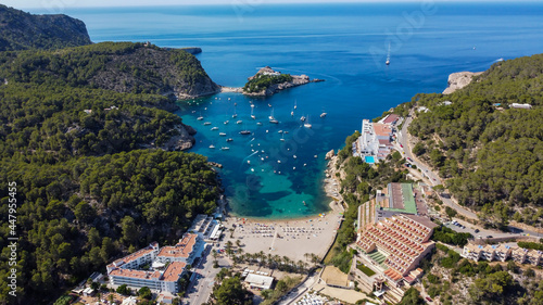 © Alexandre ROSA, Obraz premium Aerial view of the beach of Port Sant Miquel on the north shore of Ibiza island in Spain - Isolated bay sided with large hillside hotels in the Balearic Islands