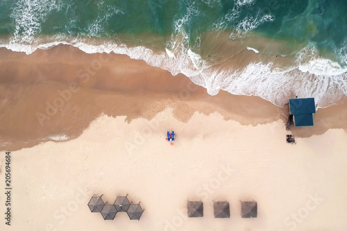 Naklejka premium Aerial view of the beach. The Mediterranean Sea, Israel..The house of the rescuer, umbrellas, sand, chaise longue..  The eyes of the sky, another view, aerial photography