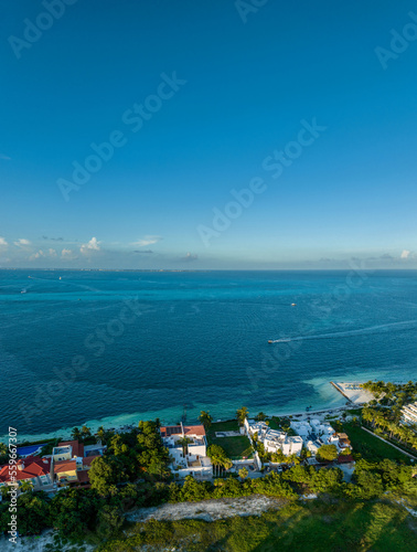 Naklejka premium Aerial view of the beautiful coastline of Cancun, Mexico. Hotel zone. Sunset.