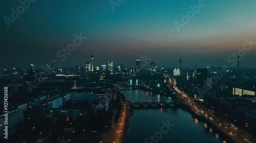 © Shozib, Fototapeta premium Aerial view of the berlin skyline at dusk, with the spree river flowing through the city center and city lights illuminating the urban landscape