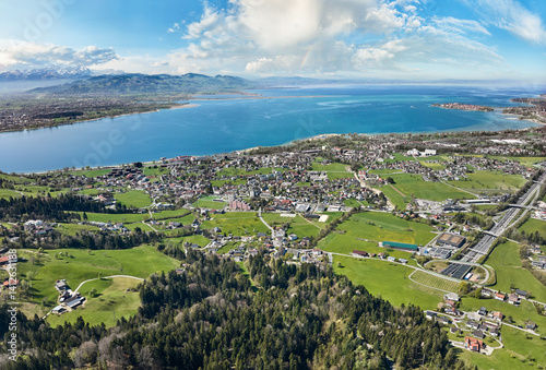 © Uwe, Fototapeta premium aerial view of the city of Lochau at Lake Constance with the highway entrance to Pfaender Tunnel in Vorarlberg, Austria
