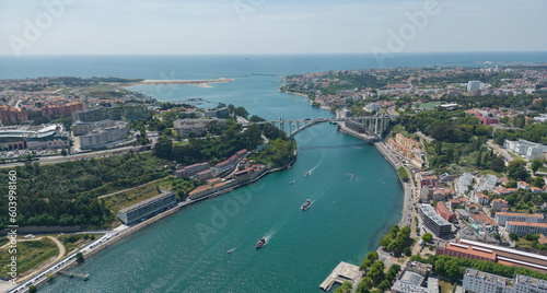 Naklejka premium Aerial view of the Douro River in Porto. Aerial drone view of the city of...