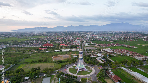 Fototapeta premium Aerial view of The extraordinary and beautiful building of the Mataram City metro monument. Lombok, Indonesia, March 22, 2022