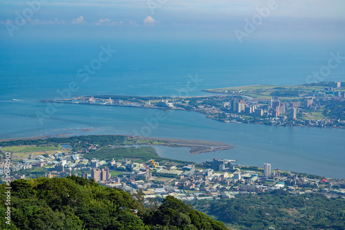 Obraz premium Aerial view of the Guanyin Shan Scenic Area and Taipei cityscape