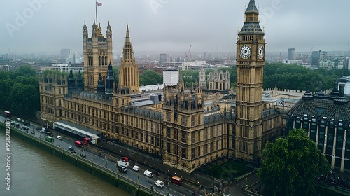 © Ben Kuang, Fototapeta premium Aerial view of the iconic Big Ben and Houses of Parliament in London on a foggy day.