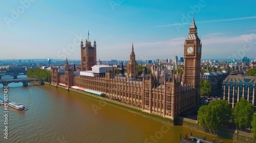 © WACHI, Naklejka premium Aerial view of the iconic Big Ben and Houses of Parliament in London, with the River Thames in the foreground and clear blue sky.
