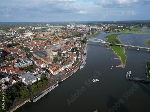 © corlaffra, Fototapeta premium Aerial view of the Ijssel river and the city of Deventer, The Netherlands
