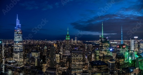 Obraz premium Aerial view of the impressive skyline of New York city at night, illuminated by numerous lights