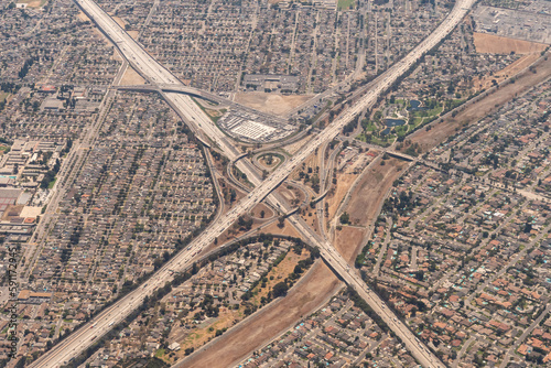 © John McAdorey, Fototapeta premium Aerial view of the interchange of the I-5 Santa Ana Freeway and the I-605 San Gabriel Freeway with the San Gabriel River and Wilderness Park in Santa Fe Springs