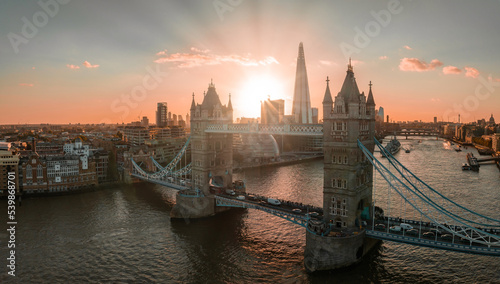 Naklejka premium Aerial view of the London Tower Bridge at sunset. Sunset with beautiful...