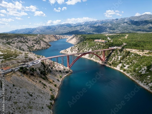 © Wirestock, Naklejka premium Aerial view of the Maslenica Bridge