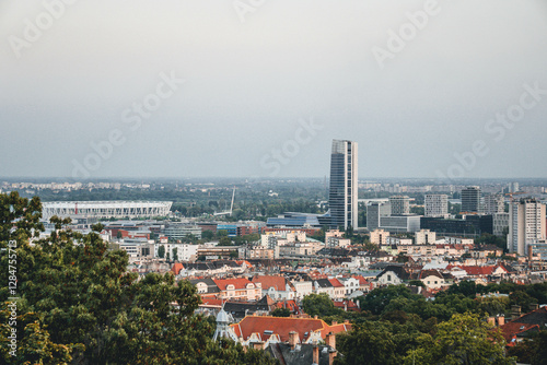 © Radoo, Naklejka premium aerial view of the modern industrial side of city with stadium and skyscrapper
