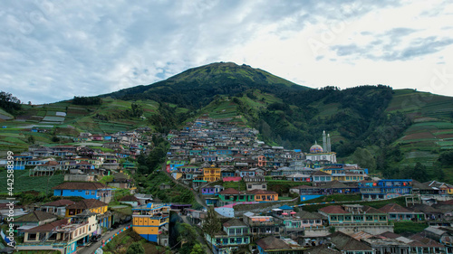 Obraz premium Aerial view of the Nepal van java is a Rural tour on the slopes of mount sumbing, The beauty of building houses in the countryside of the mountainside. Central Java, Indonesia, July 1, 2021