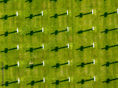 © Naeblys, Naklejka premium Aerial view of the Normandy American Cemetery and Memorial is a World War II cemetery and memorial in Colleville-sur-Mer, Normandy, France. White cross on a green lawn