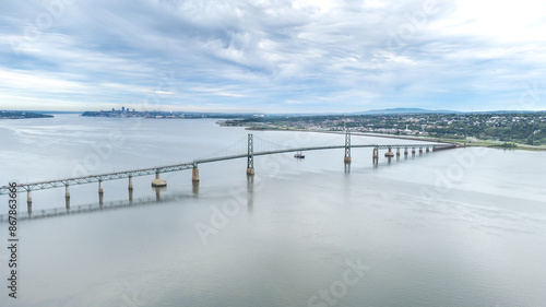 © Michel Guenette, Fototapeta premium Aerial view of the old Orlean's Island Bridge (Quebec, Canada). View of Quebec city in background.
