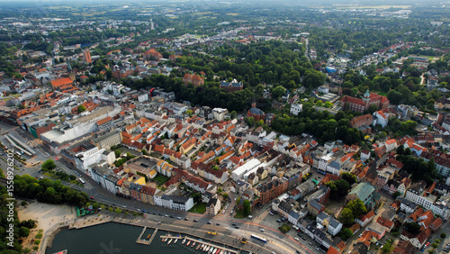 © Thekla, Fototapeta premium Aerial view of the old town of the city Flensburg in Germany on an overcast day in afternoon
