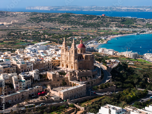 Fototapeta premium Aerial view of the Parish Church of Mellieha with twin spires and red dome above limestone buildings, Mellieha, Malta. Mellieha Bay, Comino, and Gozo appear in clear daylight.