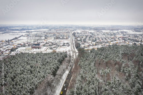 © Patryk Kosmider, Obraz premium Aerial view of the pine forest covered with fresh snow