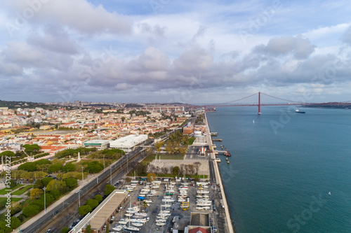 © TambolyPhotodesign, Naklejka premium Aerial view of the promenade by Belem touristic area on the Tagus river with sailing boat dock of Belem and the 25th of April Bridge in the background