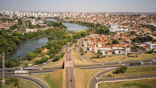 © Guga Asciutti, Fototapeta premium Aerial view of the Rio Preto municipal dam in drone panorama, aerial view on a sunny day with the avenues and highways and the park and the river in high resolution - Sao Jose do Rio Preto - Sao Paulo