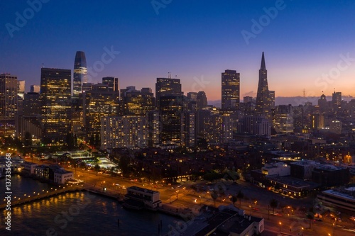 Obraz premium Aerial view of the San Francisco skyline at dusk in California, USA. The city lights illuminate the buildings and streets below. The photo captures the beauty of the city.