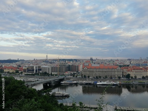 Obraz premium Aerial view of the skyline of Prague near the Vltava River under a bright sky