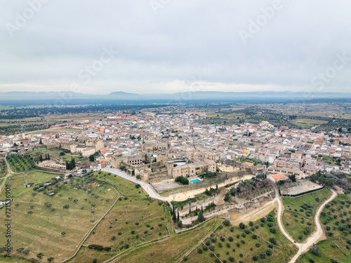 © Andrés García, Naklejka premium Aerial view of the Spanish town of Oropesa in Toledo, with its famous Parador in the foreground.