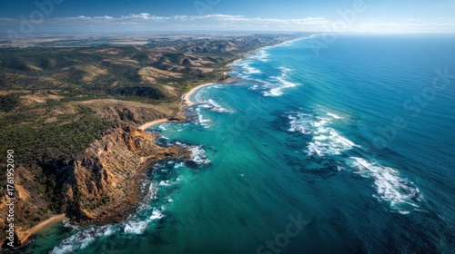 © musa, Fototapeta premium Aerial view of the stunning coastline with turquoise waters and cliffs.