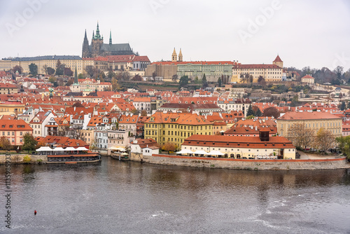 Fototapeta premium Aerial view of the Vltava River with monumental buildings of the unesco city...