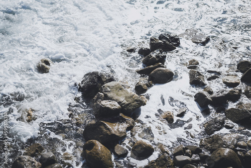 © Laura, Fototapeta premium Aerial view of the waves breaking against the rocks in a beach