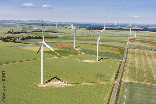 Obraz premium aerial view of the wind farm and harvest fields