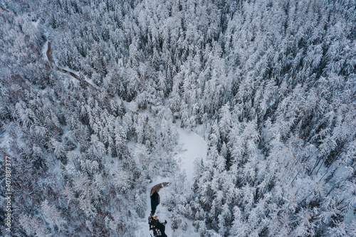 © AndreyZayats, Fototapeta premium Aerial view of the winter forest, Lindulovskaya grove. The Lintulovka River is brown. Siberian larch. Snow on the trees.
