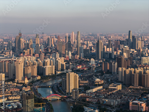 © Ziquan, Fototapeta premium Aerial view of Tianjin city skyline at dusk time, Tianjin, China