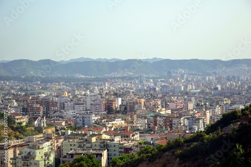 Fototapeta premium Aerial view of Tirana city ​​and outskirts, Albania. Tirana city seen from...