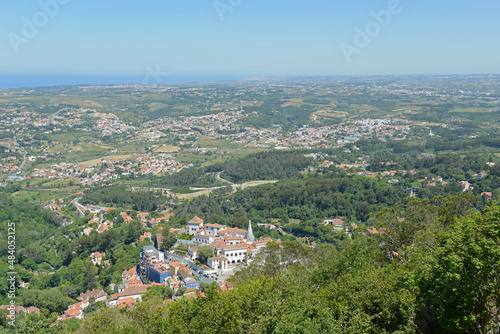 © Wangkun Jia, Fototapeta premium Aerial view of town of Sintra and landscape from top of Castle of the Moors, Sintra, Lisbon District, Portugal.