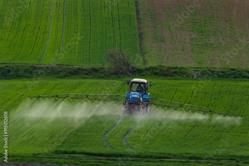 Fototapeta premium Aerial view of tractor spraying crop in green farm fields with pesticide